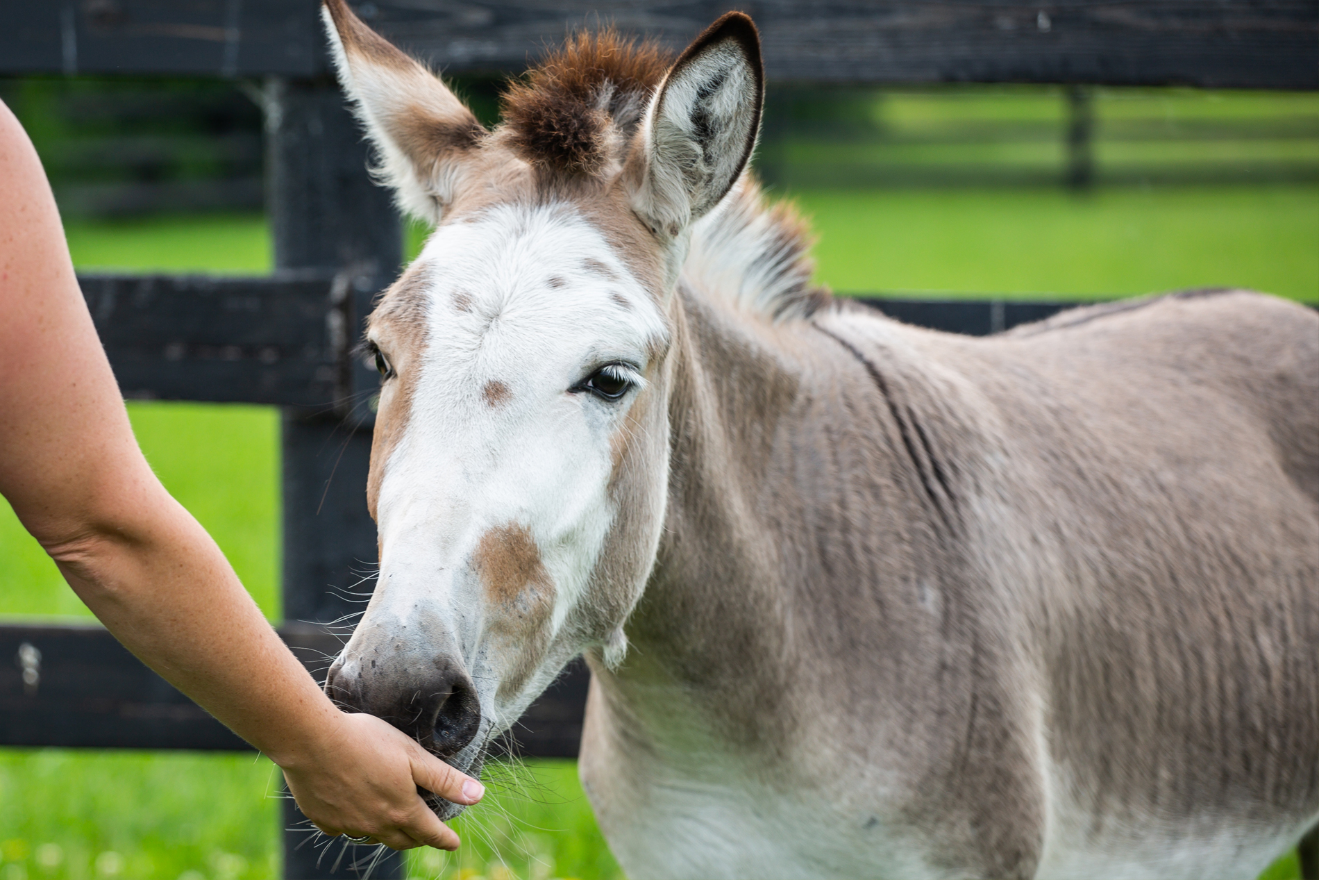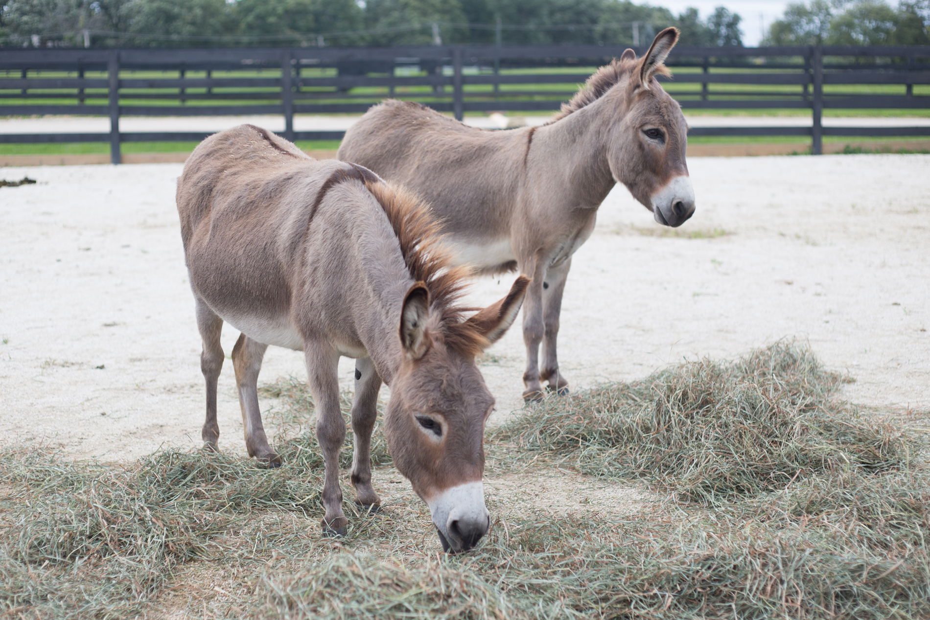Pennie and Petie were rescued donkeys from a farm in Hampshire, Illinois. They have never worn halters, been led with a rope, or been in a horse trailer. They are turned out in huge pastures with their horse friends and have their own "pent-house suite" in the main barn. They are groomed daily, fed plenty of peppermints and carrots, and have their own custom Baker sheets (fleece withers and lined, of course!)